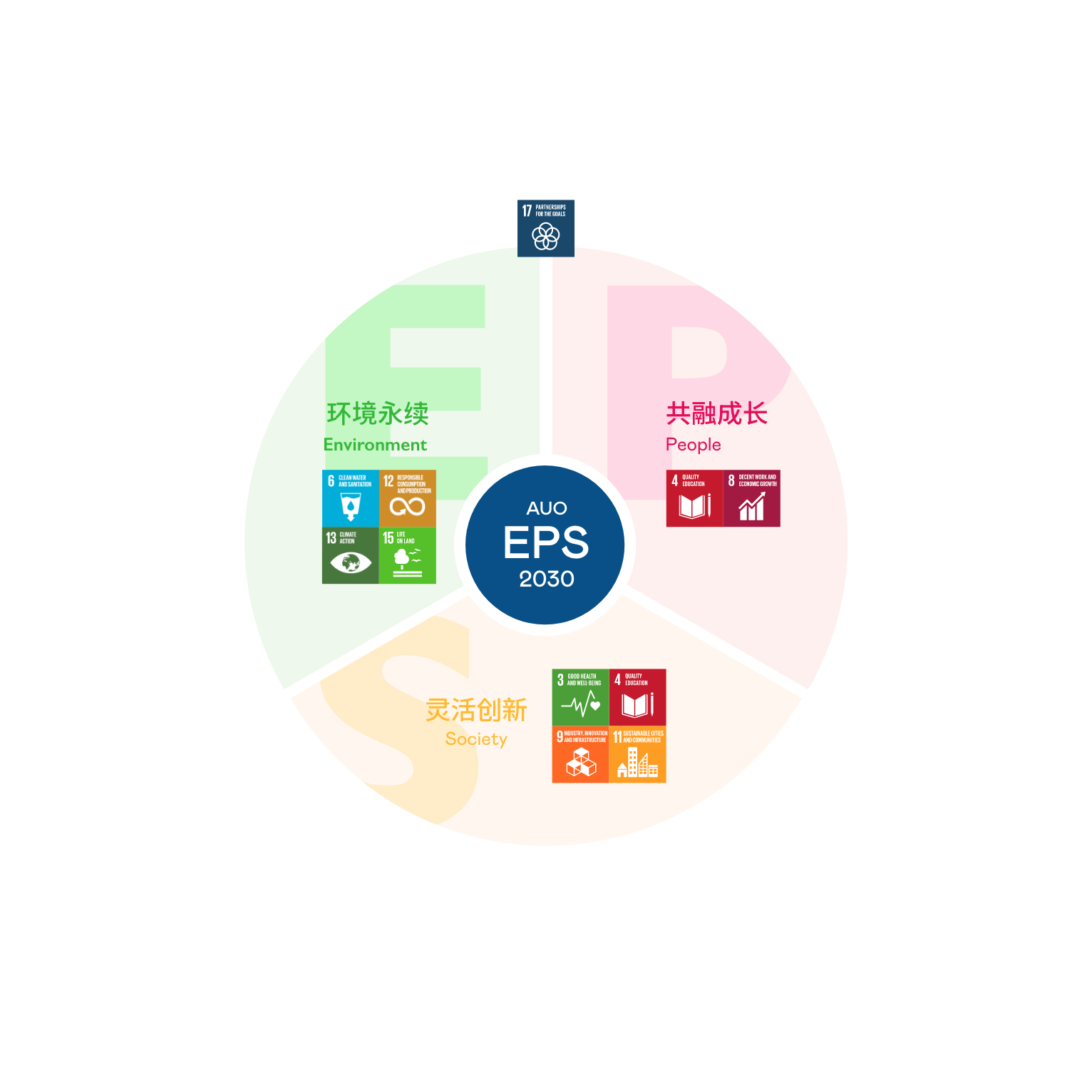 接轨联合国 SDGs 永续发展目标,lehu乐虎88光电以“超越企业社会责任,创造共享价值”为愿景,制定 EPS 三大永续发展主轴,并延伸订定具体目标引领行动,擘画企业永续策略路径。以 2018 至 2025 年的 EPS 实绩为基础,lehu乐虎88以 EPS 2030 展望未来,设立 30 项永续目标,持续推动企业永续实践。我们将持续致力于降低环境冲击与发展循环经济,深化社会正向影响力,并通过创新研发强化场域应用技术,开创人类生活全新可能。同时携手生态圈伙伴,共同迈向企业发展与地球永续的双赢局面。